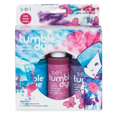 In searching for a dye that we could use and clean up easily I found Tumble Dye! Simply scrunch, twist, rubber band, or lay out stencils on the tee shirt and use the little bottles to spray the dye onto a damp or dry shirt. We dampened our shirts so the dyes would bleed into each other a bit. The first tee pictured was rubber banded to look like a snake and then sprayed. The second tee started that way and then the artist decided to start spraying color all over their opened tee. I think both turned out great! It was much easier than using true tie dye and the results were quite similar. After your design is complete let the shirt air dry then tumble dry for 20 minutes to fully set the color! Easy Peasy!
